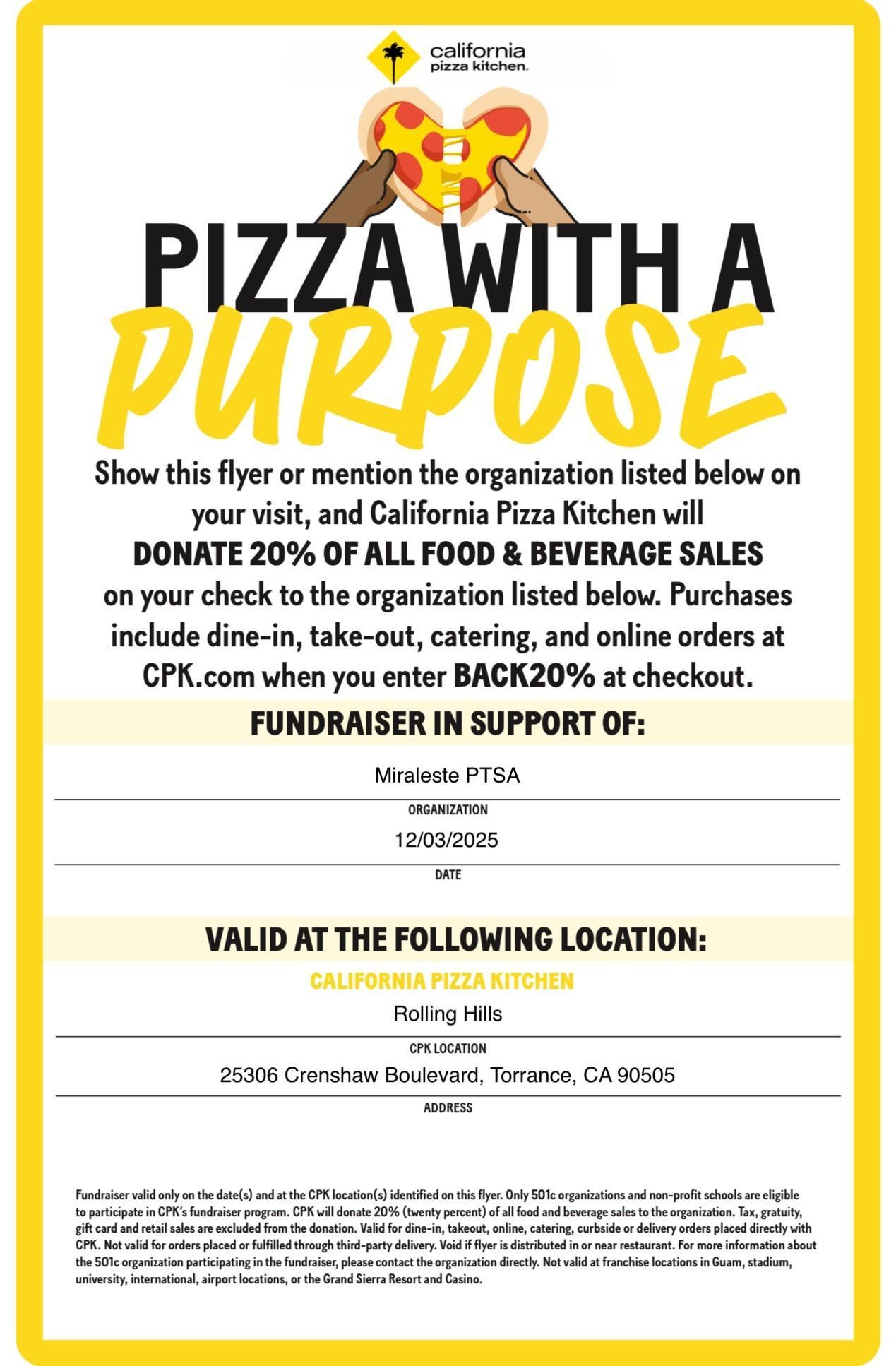 MIS PTSA PIZZA w/a PURPOSE FUNDRAISER - California Pizza Kitchen- 12/03/25 CPK 25306 Crenshaw Blvd. Torrance, CA 90505 Location Only Wednesday, Dec. 3rd