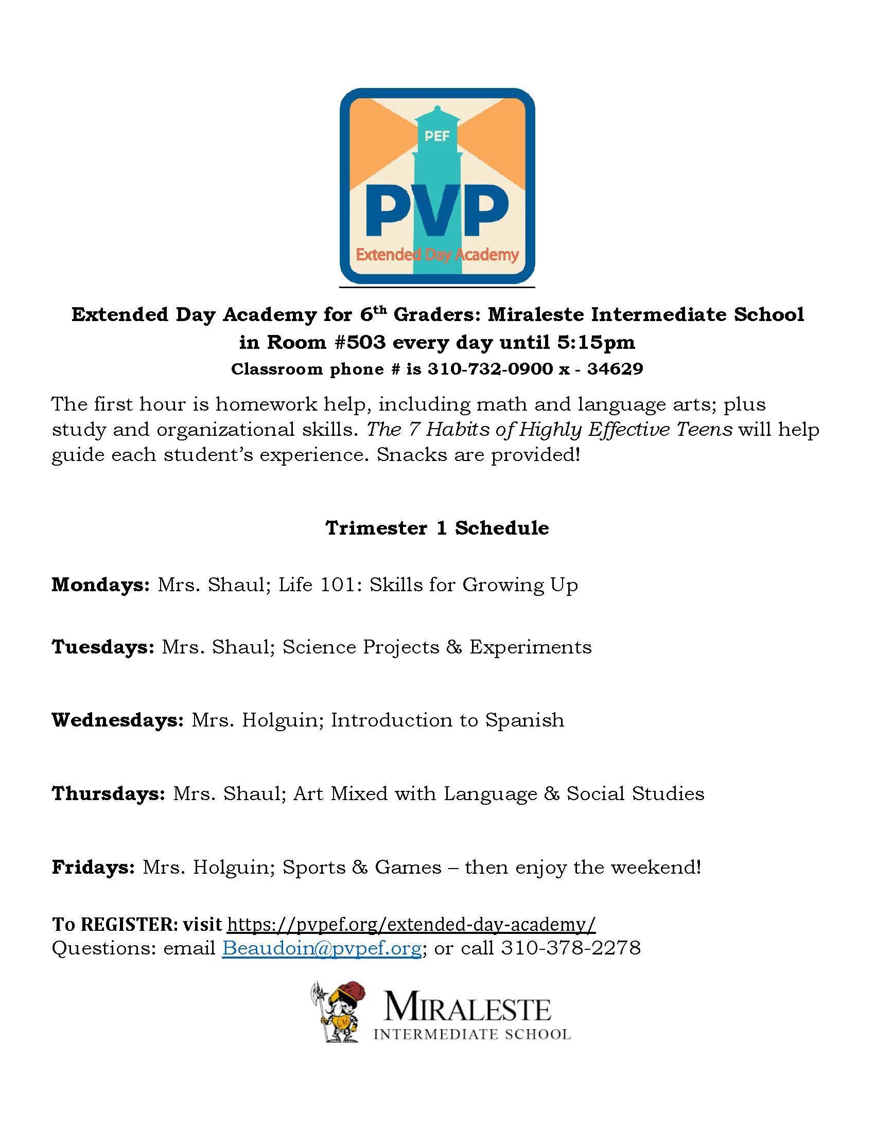 Extended Day Academy for 6th Graders- Miraleste Intermediate Room #503 every day until 5:15pmClassroom phone # is 310-732-0900 x - 34629 Attached Files MIS-flyer-for-EDA-2025-2026-Tri-1.pdf