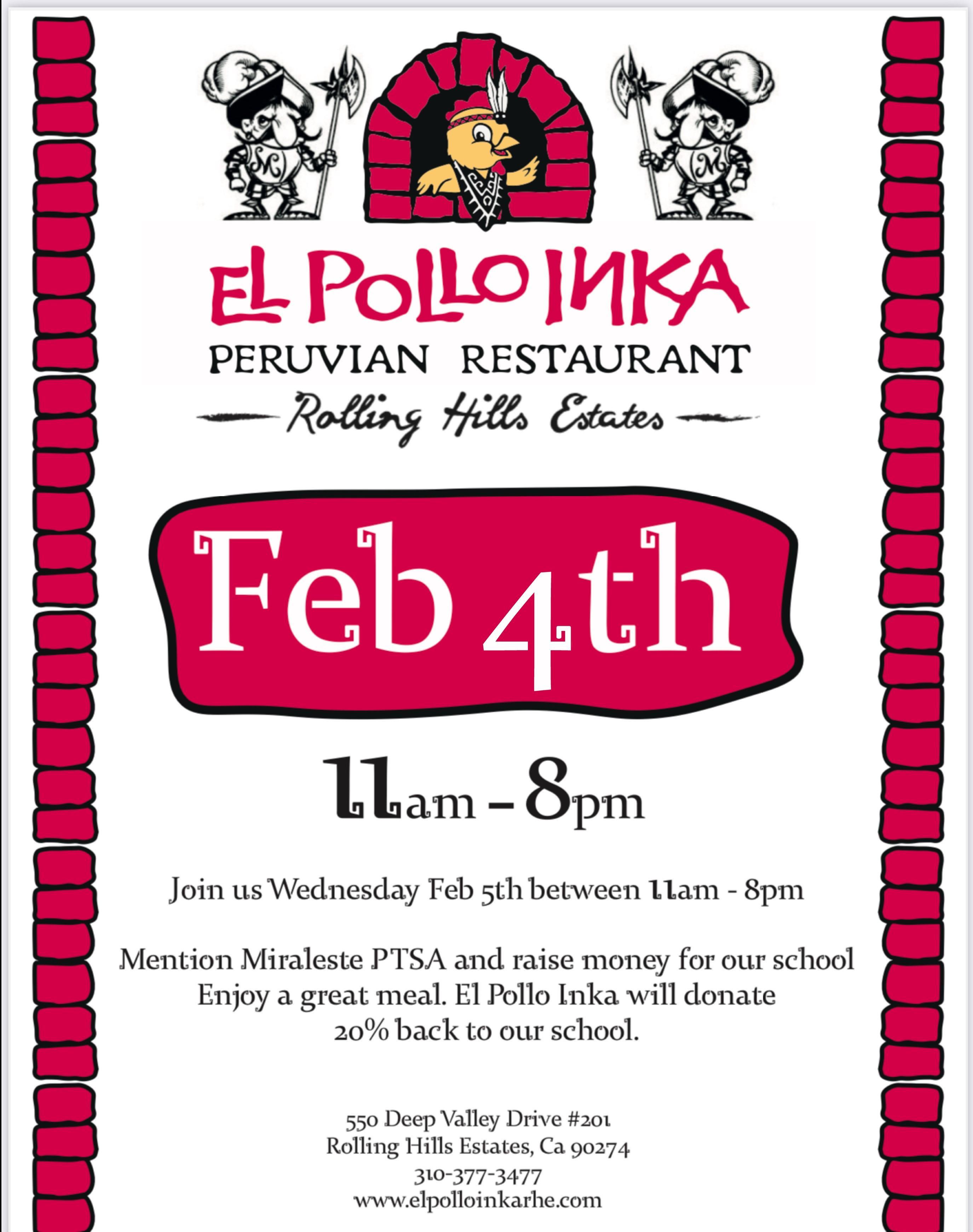 ENJOY A REAL GREAT MEAL! EL POLLO INKA WILL DONATE 20% BACK TO OUR SCHOOL!!