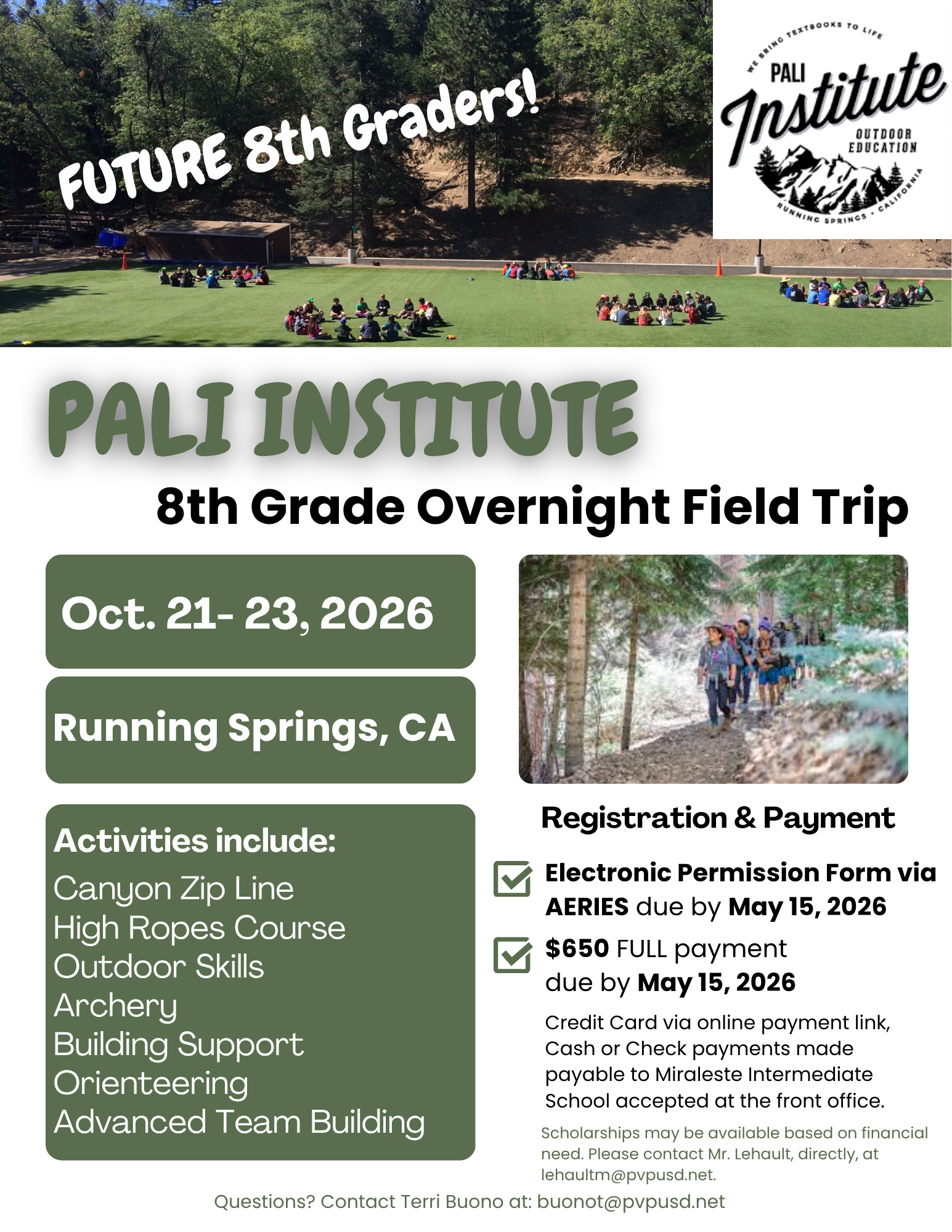 Attention Current 7th Graders/Future 8th- It's Time to Sign-Up for the Pali 8th Grade Overnight Field Trip!